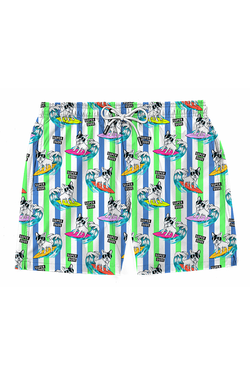 Costume da uomo a fantasia. Tessuto leggero ad asciugatura rapida, slip interno in rete, spacchetti sui lati, chiusura con coulisse, tasche anteriori e taschino posteriore.